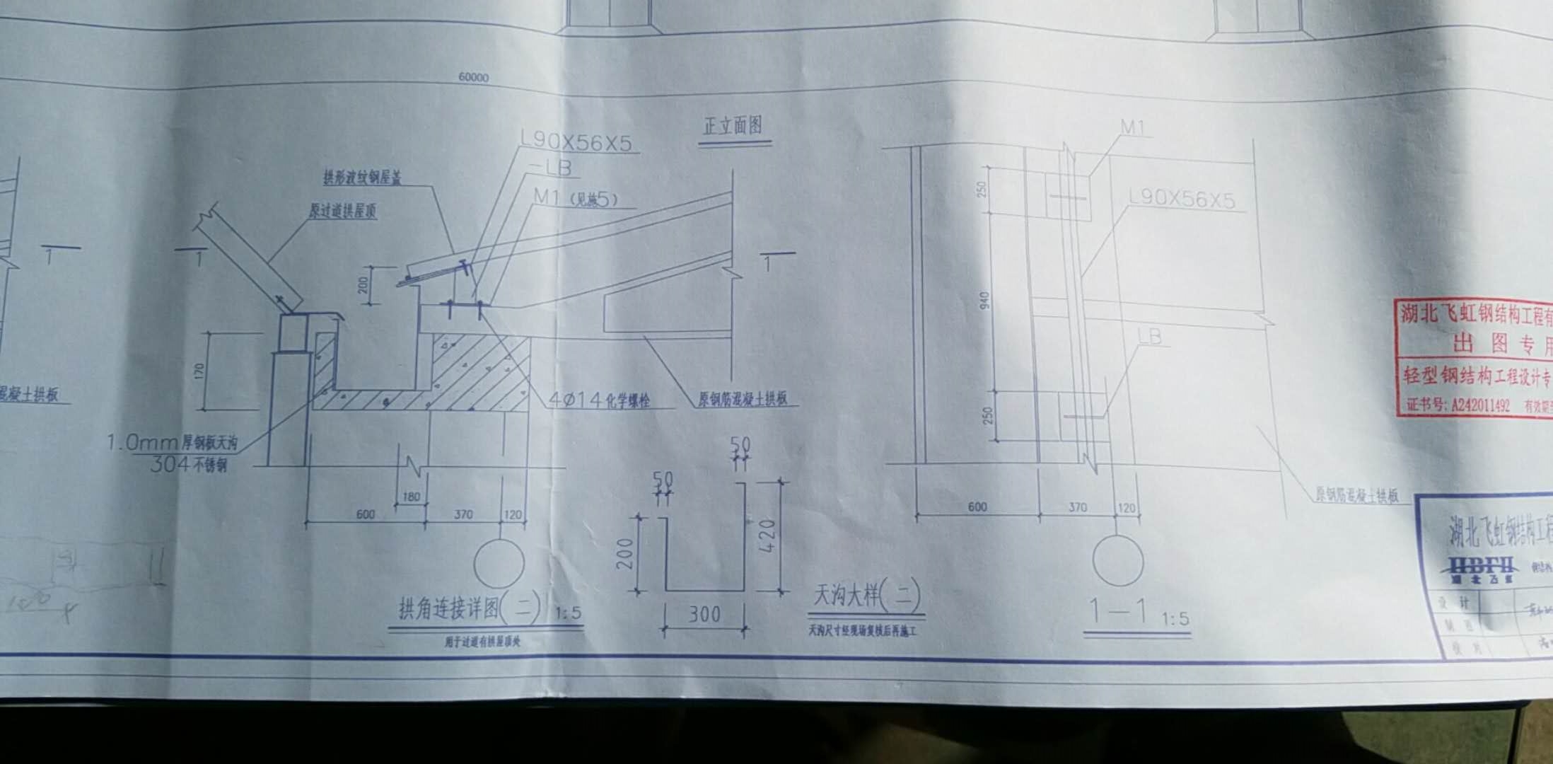 5.與拱腳相連的連接角解可由銅板奇折面成,銅板厚度不隨小于4mm,與屋蓋相連邊的尺寸應(yīng)淋足拱腳處螺釘(螺栓)布置的構(gòu)造要求。角鋼兩肢與水平酮的夾角應(yīng)根都屋董矢跨比確定。